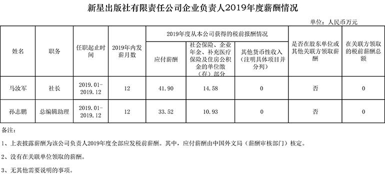 新星出版社有限責任公司企業(yè)負責人2019年度薪酬情況